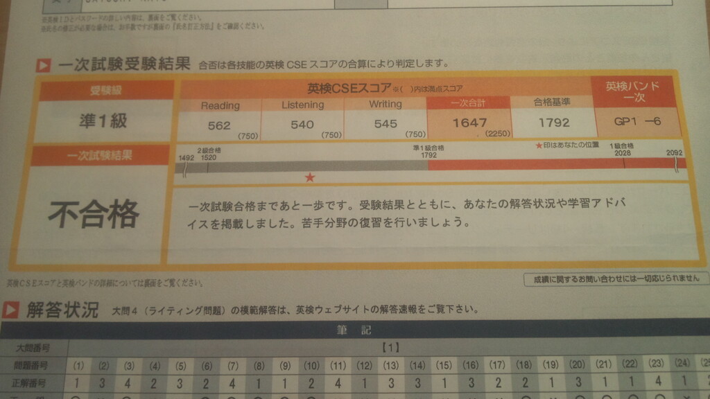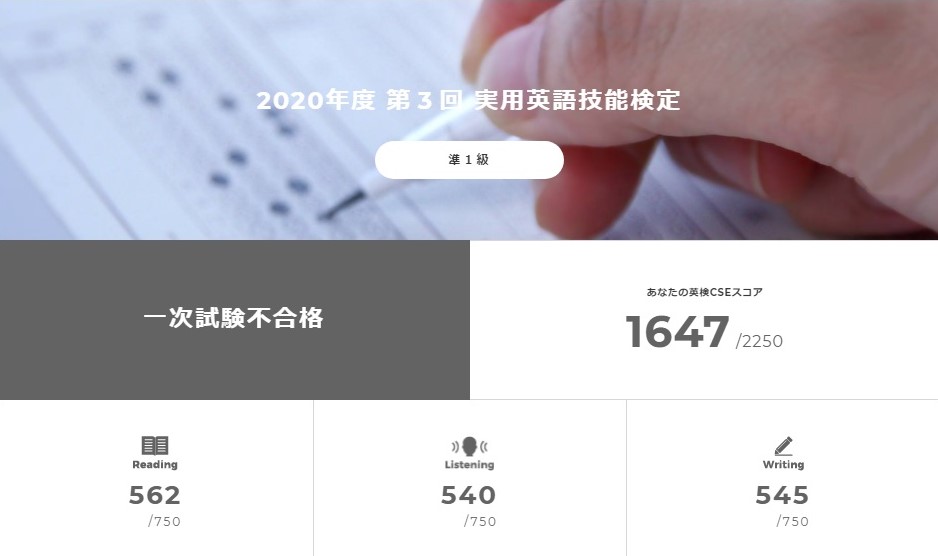2020年度第3回英検・1次試験結果 郵送でも届きました